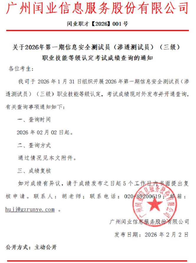 2026年第一期信息安全测试员(渗透测试员)(三级) 职业技能等级考试认定成绩查询的通知