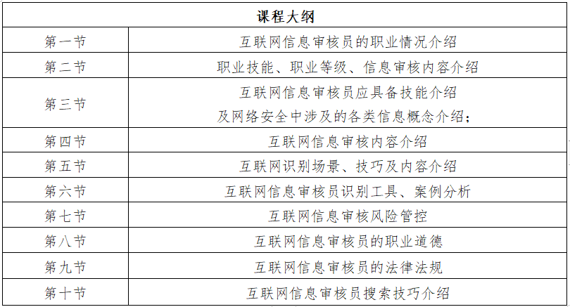 一、课程介绍: 2020年6月,根据人社部办公厅文件,“网络与信息安全管理员”职业下增设“互联网信息审核员”工种。 互联网信息审核员是一个新兴的职业,是随着互联网的发展而产生的,随着互联网信息量越来越大,为了确保信息的合法性和规范性,以及通过信息的规范和筛选来表现公司企业的意志,于是产生了信息审核的行业,也随之产生了信息审核员的职位。